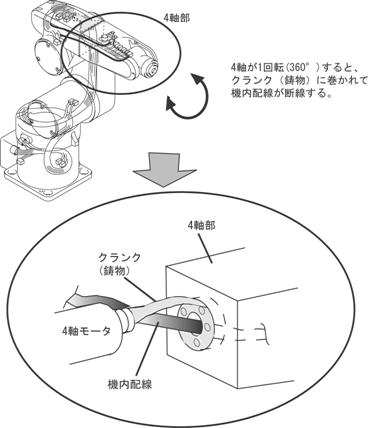 4軸を360°以上回転させると機内配線が断線するので注意(4軸メカエンド無し機種)