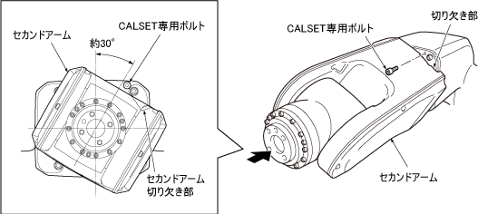第4軸のCALSET位置は、セカンドアームを回して、CALSET専用ボルトの頭部にセカンドアームの切り欠き部が当たる位置です。