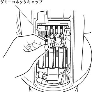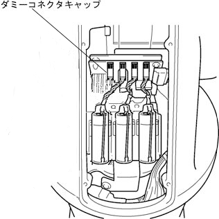 出荷時の状態では、3つのコネクタにエンコーダバックアップ電池が接続され、残り1つのコネクタにはダミーコネクタキャップが取り付けられています。