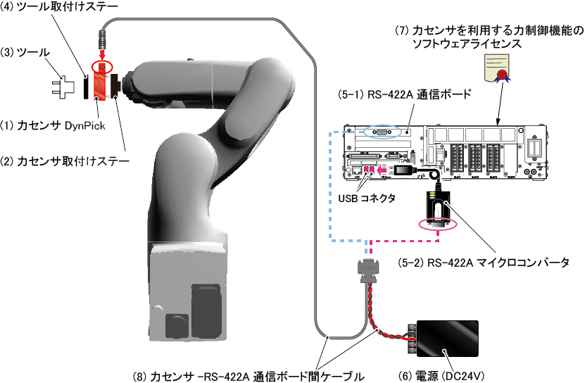 ここでは、株式会社ワコーテック製の力センサを使用する場合における、力センサを利用する力制御機能に必要な機器について説明します。