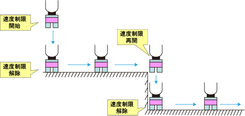 速度制限中のロボットの動作速度は、"最大並進速度"または"最大回転速度"の設定値以下に抑えられます。