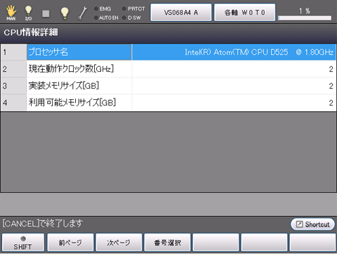 操作経路:[F6 設定] - [F2 システム情報] - [コントローラ タブ] - [F2 CPU情報詳細]
