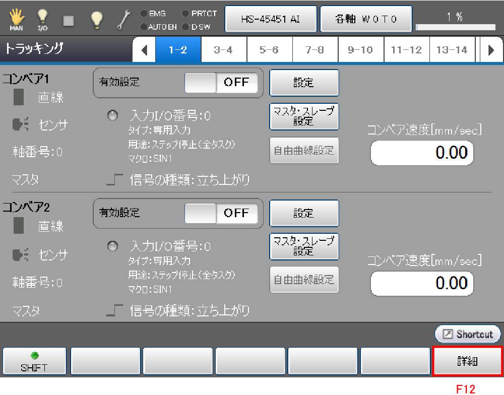 | 速度比例ゲイン | コンベアの速度を上げた際に、ロボットの追従精度が悪化する場合に使用します。 ロボットがワークに追いつけない場合は、値を1より大きくしてください。 ロボットがワークを追い越す場合は、値を1よりも小さくしてください。 |
