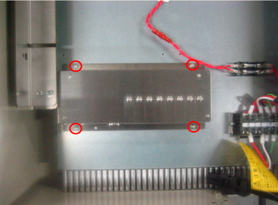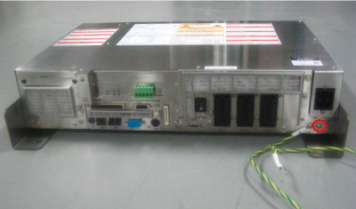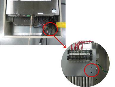 端子台の近くにある○部のM4ねじを2本取外し、STEP5で取付けたFGハーネスと本体間ケーブルのFGハーネスを、それぞれ別のねじで固定します。