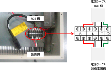 端子台カバーを外し、加工済の電源ケーブルを図の通り配線します。(M4ねじ)