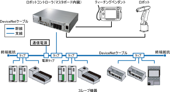 幹線とは、両端に終端抵抗を取付けたケーブルをさします。 支線とは、その幹線から分岐したケーブルをさします。 幹線・支線ともDeviceNet太ケーブル、DeviceNet細ケーブルまたは両方を使用して構築することができます。