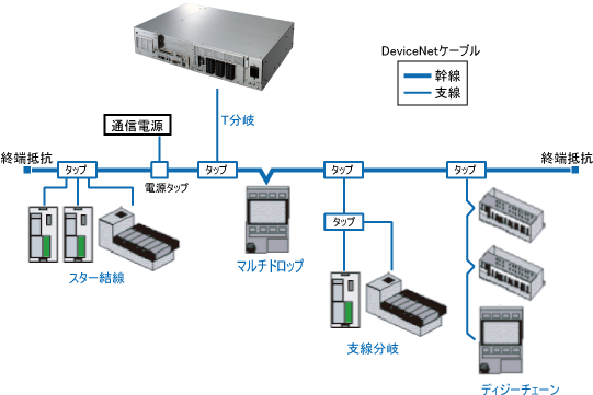 DeviceNetの接続方式には、下図のようなマルチドロップ・スター結線・T分岐・ディジーチェーン・支線分岐など、さまざまな接続形態を取ることが可能です。
