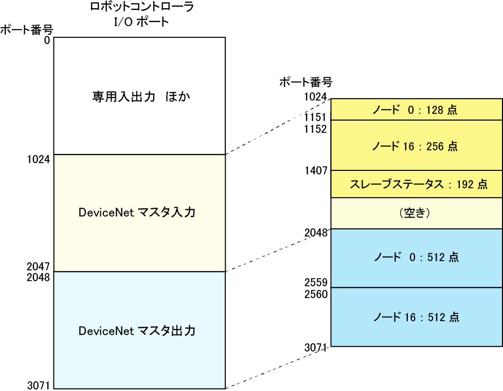 DeviceNetマスタボードのポート番号は、以下のとおりです。ロボットコントローラのI/O領域は、「I/Oポートマップと割付」を参照してください。