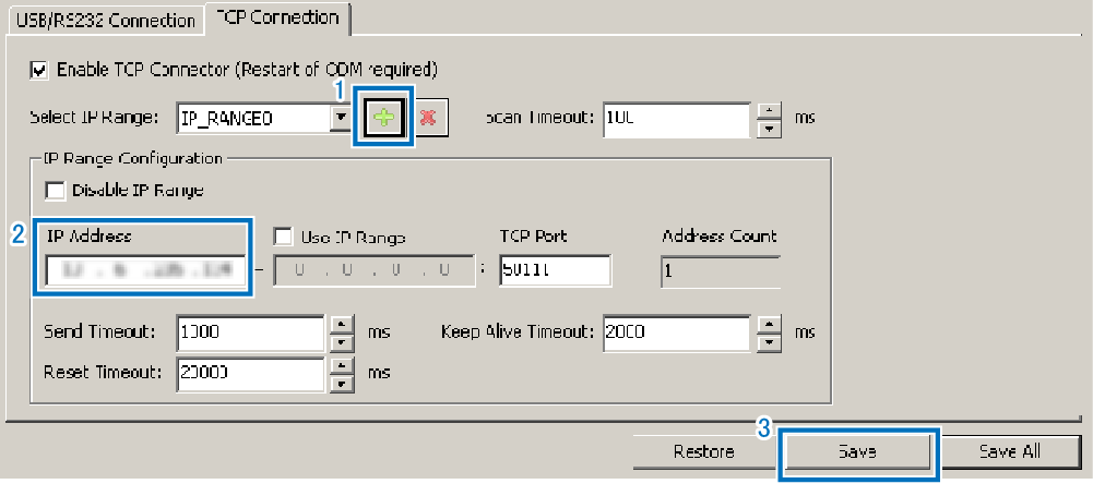 [TCP Connection]タブから1の[+]ボタンをクリックします。その後2にロボットコントローラのIPアドレスを入力し、3の「Save」ボタンをクリックします。