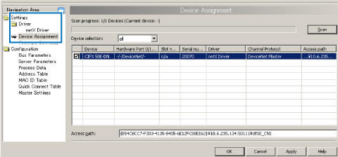 画面表中に「CIFX50E-DN」または「CIFX」というデバイスが見つかるので、チェックを付けて「OK」をクリックします。見つからない場合には、「Device selection」欄を”all”にして、「Scan」ボタンをクリックしてください。