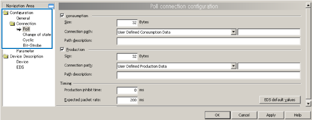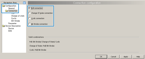 スレーブ機器との通信方法を、「Poll connection」、「Change Of state connection」、「Cyclic connection」、「Bit-Strobe connection」の中から選択します。 機器がサポートしていない通信方式はグレー表示となり、選択できません。