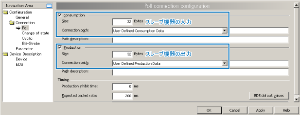 画面右から入出力サイズを設定します。上部の「Consumption」がスレーブ機器の入力(ロボットコントローラ側の出力)、下部の「Production」がスレーブ機器の出力(ロボットコントローラ側の入力)のサイズとなります。ここでの設定はバイト単位(1バイト=8点)で行います。なお、必要に応じて「Connection Path」を変更してください。