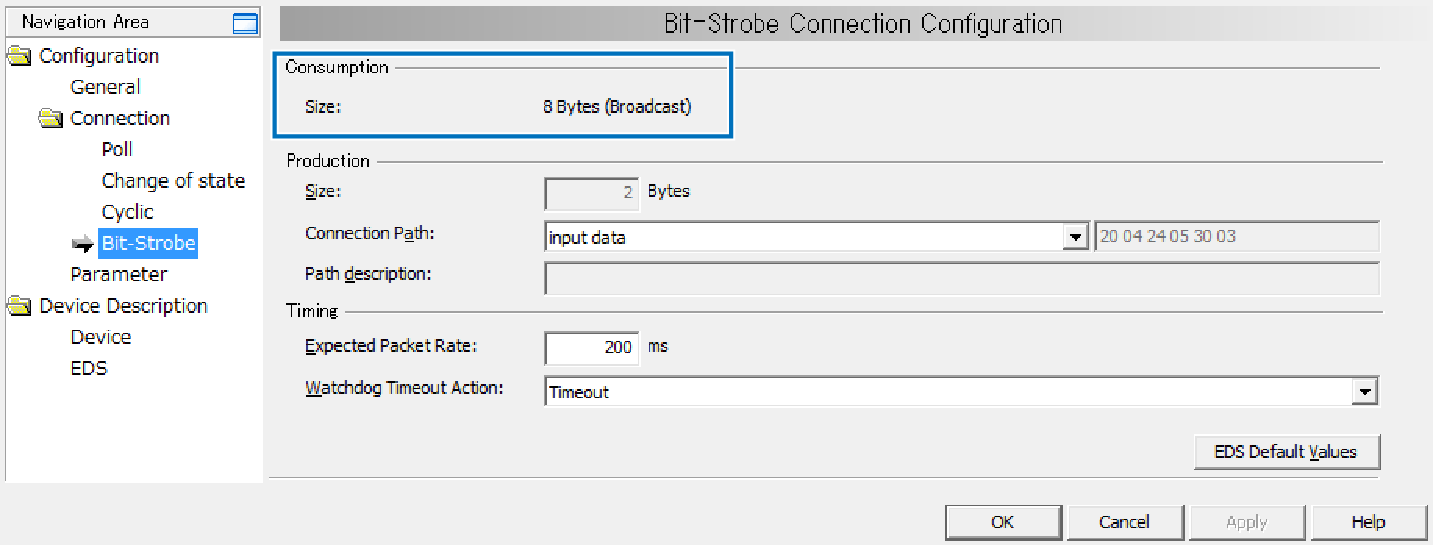 Bit-Strobe connectionを使用する場合は、上部の「Consumption」に8バイト固定値が定義されることがあります。この際、DeviceNetマスタ出力が64点専有されることになるので注意してください。