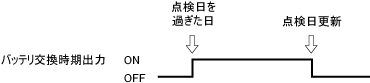 エンコーダバッテリ点検日を過ぎている場合に、ONします。 エンコーダバッテリ点検日は、ティーチングペンダントの[F6 設定] - [F7 日付とメンテナンス]-[F3 エンコーダバッテリ]で設定されている日付です。