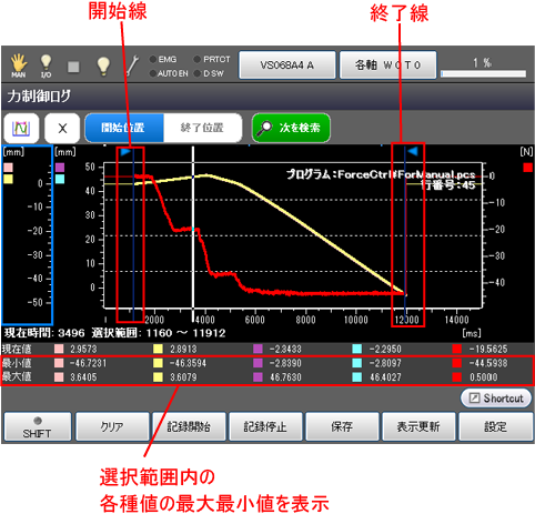 | [F3 記録停止] | 力制御ログの取得を終了します。 |