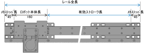 レール全長のうち、ロボット本体長160mmとメカストッパ長45mm×2個を除いた長さが有効ストローク長になります。下記の計算式で必要なレール長を求め、求めた長さ以上のレール全長をレールユニット組合せ表 (PDF:100KB) からお選びください。