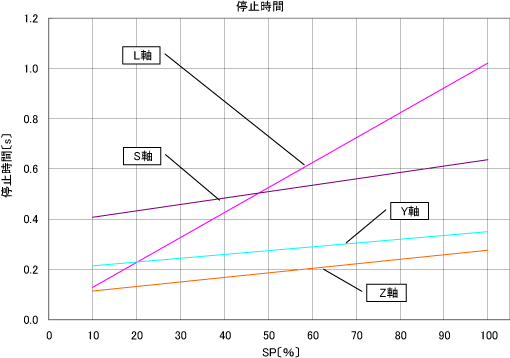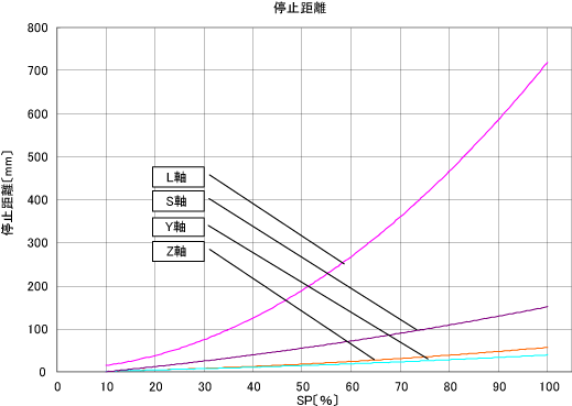 ロボット動作中に非常停止ボタンが押された場合、主3軸の停止時間と停止距離はスピードにより以下の図のように変化します。複数軸組合せ時の停止時間は、最も動作時間が長い軸の停止時間です。また負荷条件によるばらつきはありません。
