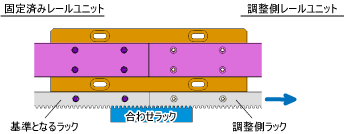 固定済みレールユニットのラックを基準とし、合わせラックにより調整側ラックとのピッチを調整します。