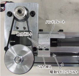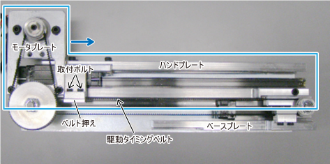 固定のベースプレートに対して、モータプレートとハンドプレートを一緒に青矢印方向にずらします。適切な可動範囲となるよう駆動タイミングベルトの連結位置を決め、取付ボルト2箇所で固定します。
