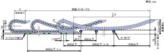 - ケーブルベヤの固定端より1つ目のリンク中心から、最も近いガイドまでの距離は88.5mm以下としてください。*2