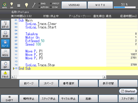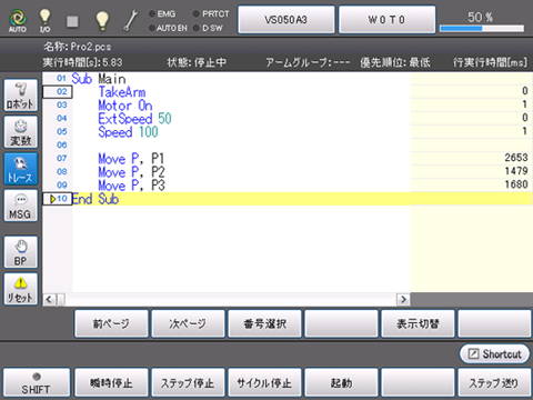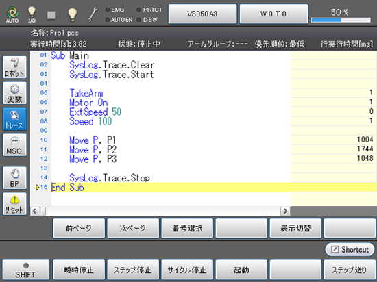自動モードやティーチチェックモードで、プログラムの内容表示画面の[トレース]ボタンを押すと、トレースログをモニタできます。