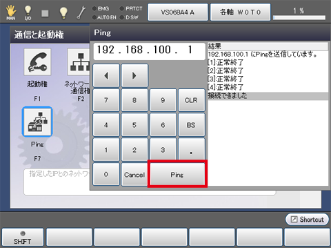 テンキーでIPアドレスを入力し、[Ping]を押すと、結果が表示されます。