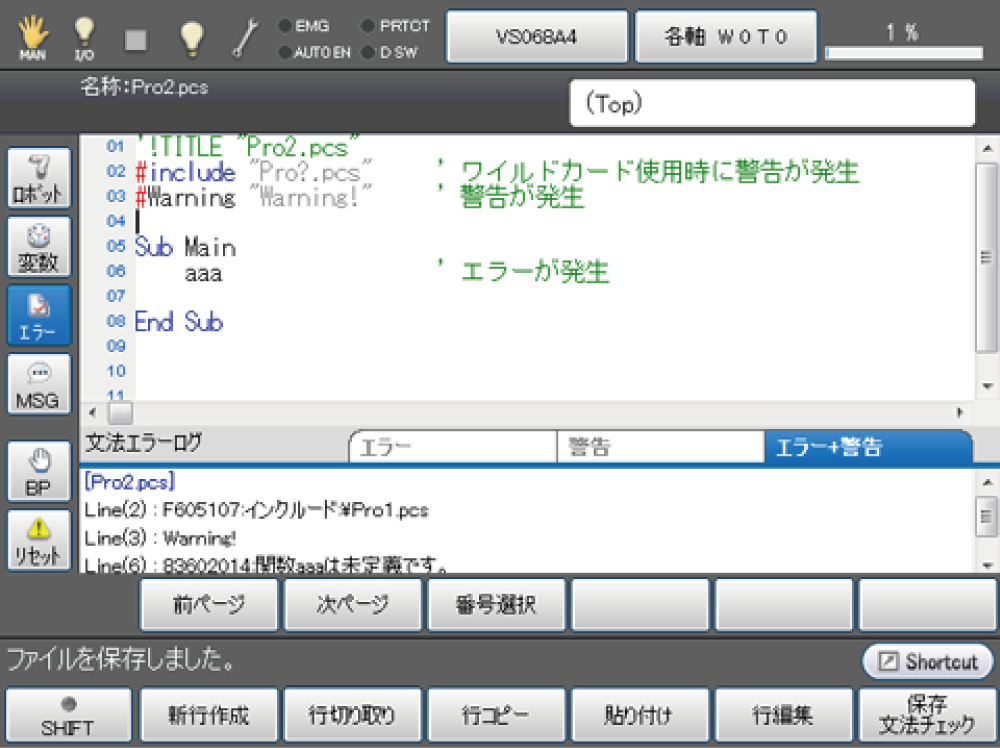 文法エラーログ表示部の上部にあるタブを選択することで「エラー」、「警告」、「エラー+警告」の表示を切り替えることができます。