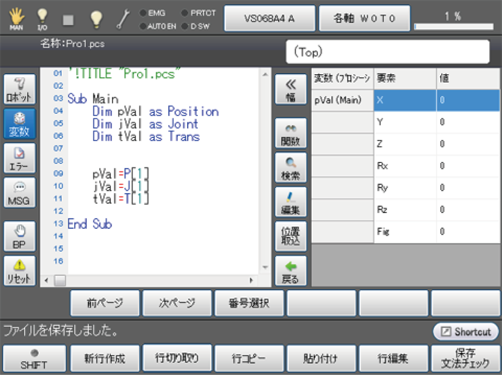 現在位置を、P型、J型、T型の変数に登録します。 このボタンを押すと、取り込み確認画面が表示されますので、[OK]を押します。中止する場合は[Cancel]を押します。 このボタンは、変数に現在位置が登録可能な場合にのみ、表示されます。 |
