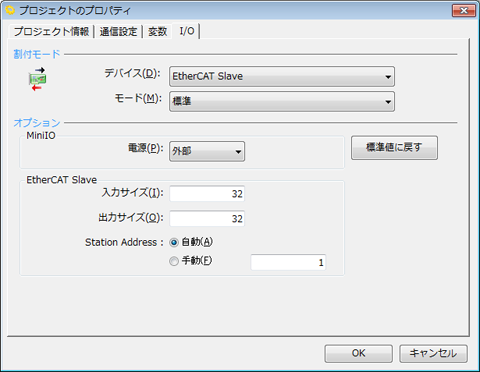 I/O増設ボードとしてEtherCATスレーブボードを使用する場合、WINCAPSIII「プロジェクトの設定 」「I/O」タブにて下記の情報を登録する必要があります。