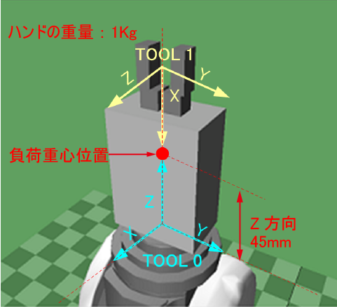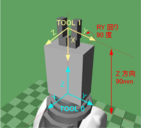 実施例のハンドは TOOL座標のZ方向に90mmオフセットしています。