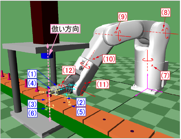 また、ワーク取り出しや圧入位置の状態でTOOL座標のRY回りに90deg回転しています。
