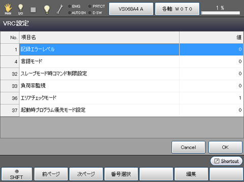 | [F5 編集] | 変更したいパラメータを選択し、[編集]を押すと入力画面が表示されます。項目を選択し、入力画面上の[OK]を押すと、内容が変更されます。 変更した値は、[VRC設定]ウィンドウの[OK]を押すことで確定します。 |