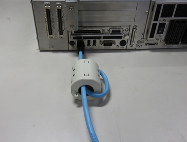 HSR、HSA1シリーズのロボット(UL仕様除く)で、本体間ケーブル長が12m以上をご使用の場合は、本体間ケーブルに同梱されているフェライトコアを、LANケーブルに2ターンさせてください。
