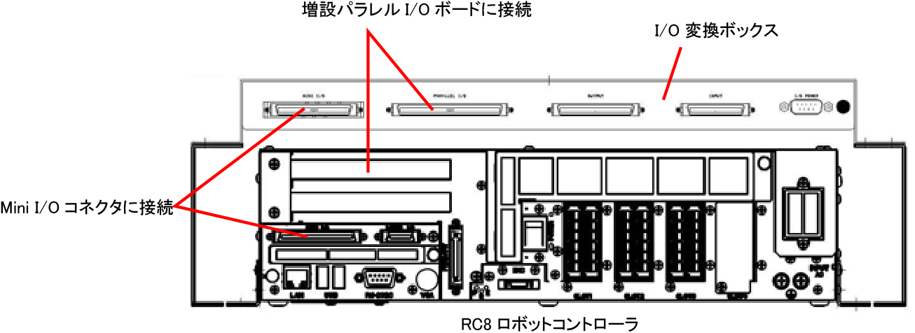 | I/O変換ボックス | RC8ロボットコントローラを跨いで、4本のスクリューで設備に取り付け、付属の「Mini I/O 接続用ケーブル」と「パラレルI/O接続用ケーブル」を使用してRC8ロボットコントローラに接続します。 |