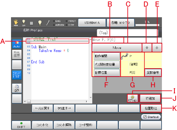| J | 行追加ボタン | 現在設定されているコマンドとパラメータの文字列をコマンド追加カーソルの位置へ挿入します。 |