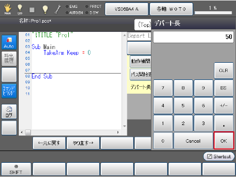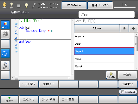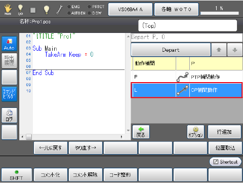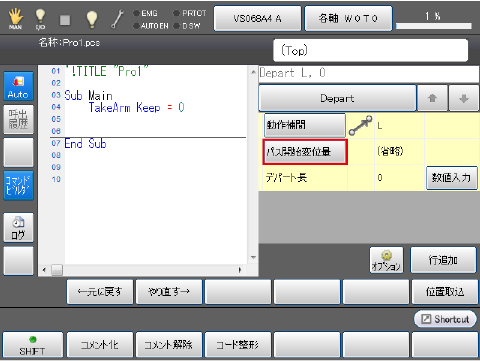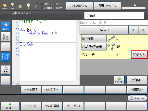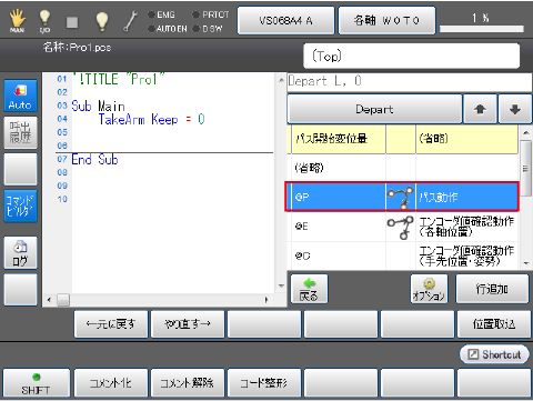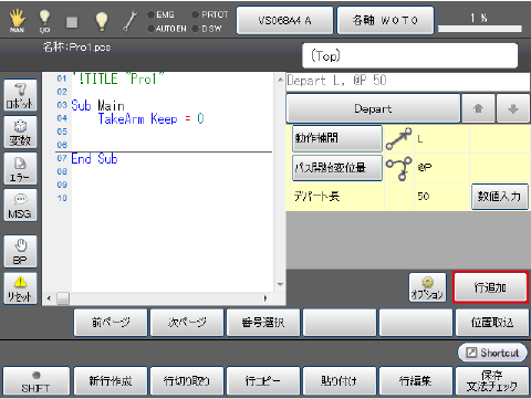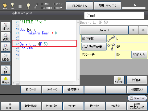ここではプログラムの7行目に「Depart L, @P 50」を入力する場合を例に説明します。
