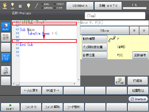 コマンドを挿入する位置を設定します。画面タッチ、上下キー、ジョグダイアルを使用してコマンド追加カーソルを6行目に移動します。