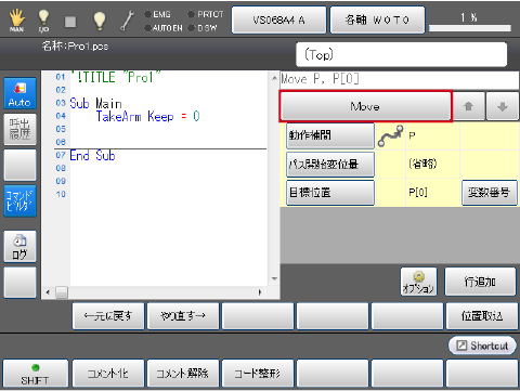 ただし、P型、J型、T型の要素に変数、関数、マクロ定義が使用されている場合は、位置取込ができません。Move P, P( 446.7207, 275.725, 329.036, 180, -0.0122849, -148.3163, 5 )Move P, P( aaa, 275.725, 329.036, 180, -0.0122849, -148.3163, 5 ) '位置取込不可