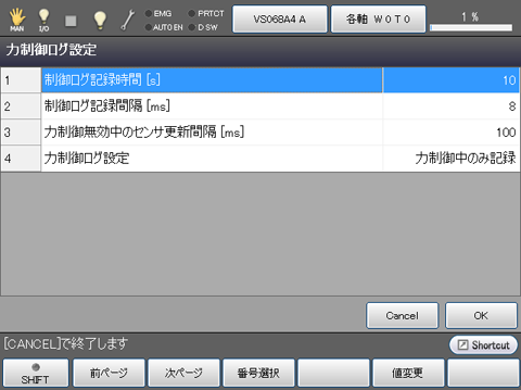 操作経路:[F2 アーム] - [F2 力制御] - [F2 力制御ログ] - [F6 設定]
