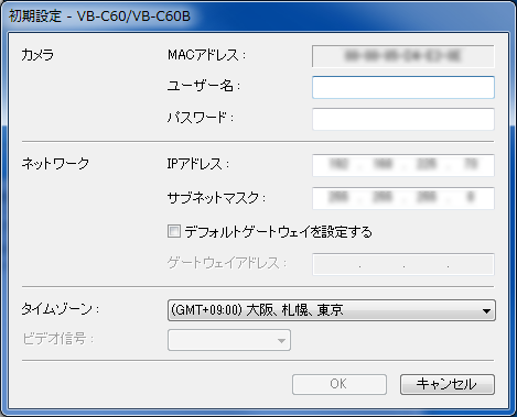 ユーザー名「root」と工場出荷時のパスワード「camera」を入力します。次に設定するIPアドレスとサブネットマスクを入力し[OK]を押します。