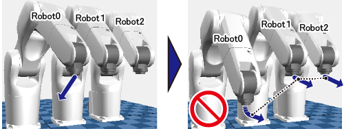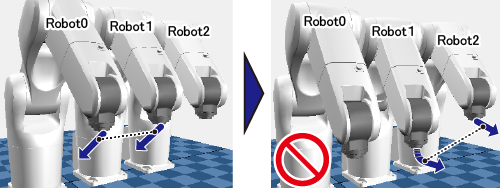 Robot0とRobot1の動作をパス動作でつなげる(パス動作させるロボットの組合せが一致しているパターン)。