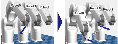 Robot0の動作と、Robot0とRobot1およびRobot2の動作をパス動作でつなげる(パス動作させるロボットが3台以上のパターン)。
