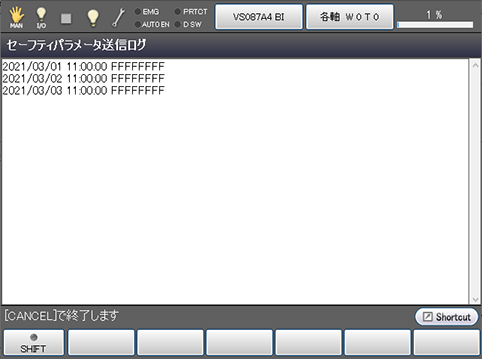 操作経路:[F2 アーム] - [F12 保守] - [F5 セーフティモーション] - [F3 送信ログ]