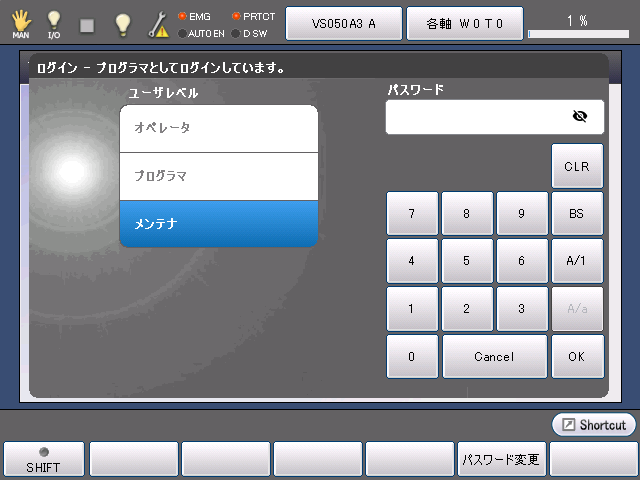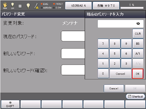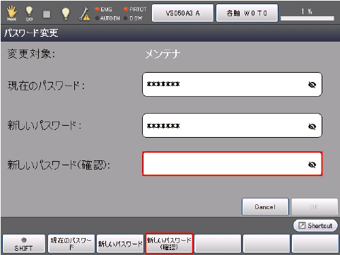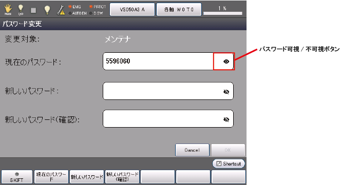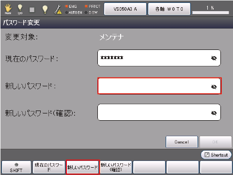 パスワード入力キーの操作方法については、ティーチングペンダント操作ガイドの「パスワード入力キー」を参照してください。