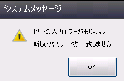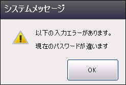 入力に誤りがあると、下図のエラーメッセージが表示されます。[OK] ボタンを押すと、パスワード変更画面に戻りますので、再度、パスワードの入力操作を行ってください。