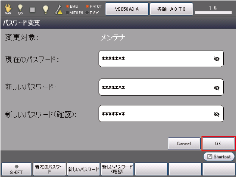 パスワード変更画面に戻りますので、すべて入力が完了していることを確認し、[OK] ボタンを押します。