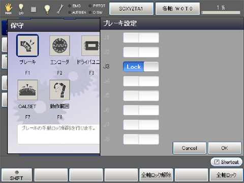 [ブレーキ設定]ウィンドウが表示されます。該当する軸の[Free]および[OK]を押します。
