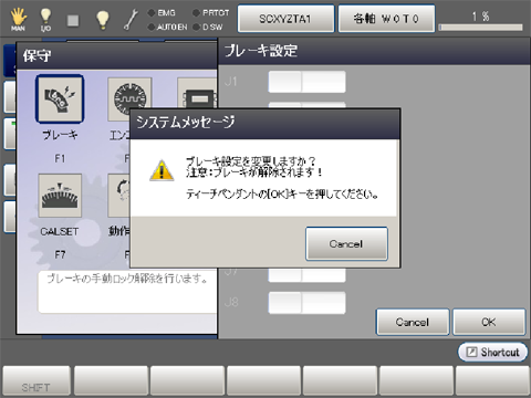 確認用システムメッセージが表示されます。ティーチングペンダントの[OK]を押し、該当軸のブレーキを解除します。