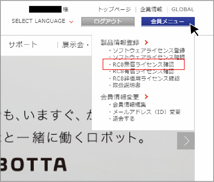 会員メニューの"RC8無償ライセンス確認"を選択します。