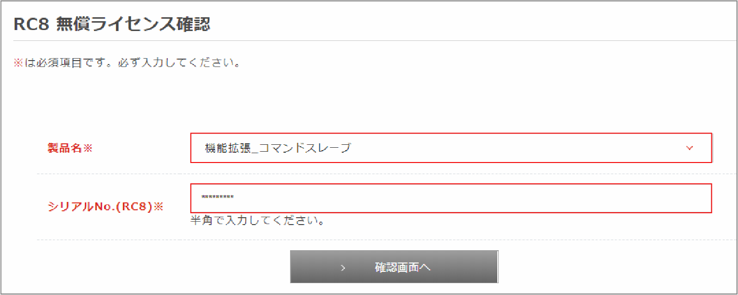 RC8 無償ライセンス確認画面へ移行し、「製品名」と「シリアルNo」を入力します。